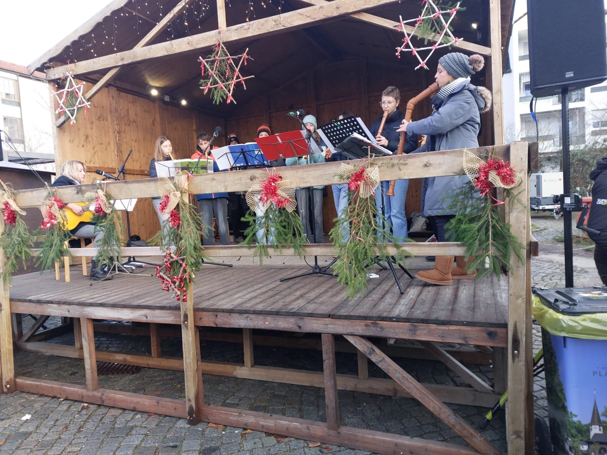 Im weiteren Verlauf gestaltete das Blockflötenensemble unter der Leitung von Frau Schmitt ein rund halbstündiges weihnachtliches Programm. Die Musikerinnen und Musiker spielten auf Sopran- bis Bassblockflöten, begleitet von Gitarre. Das Repertoire umfasste traditionelle und internationale Weihnachtslieder aus verschiedenen Ländern, darunter auch ein eigens für das Ensemble arrangiertes „Last Christmas“. Als Zugabe erklang „Jingle Bells“.