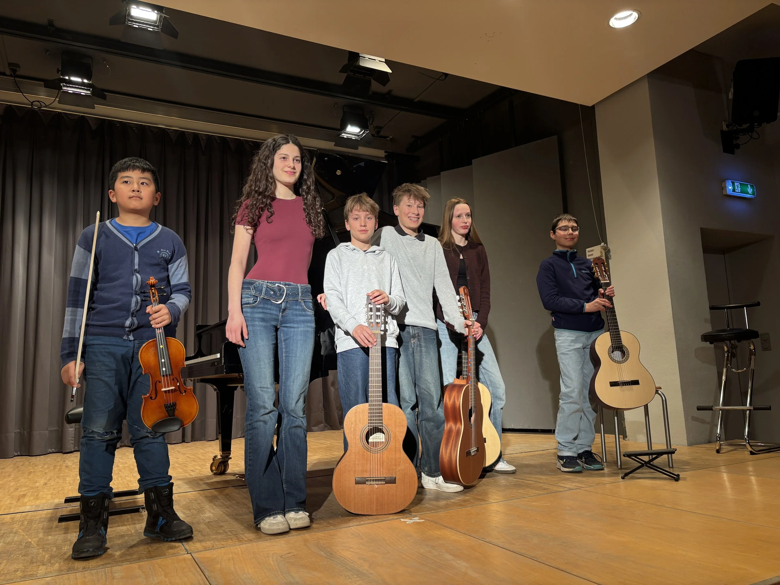 Das fünfte Mittwochskonzert des Schuljahres stand unter dem Motto "Frühlingsklänge". Neben vielen Gitarrenbeiträgen der Klassen Hr. Straub und Hr. Marti durften die Zuschauer*innen Beiträge der Klassen Violine (Fr. Cramer) und Klavier (Fr. Glauber-Diehl) bewundern. Stücke von Renaissance bis Pop waren zu hören.